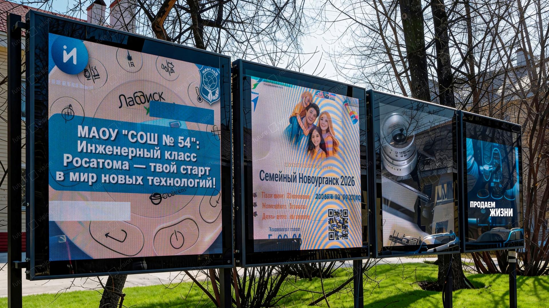 Завод Future Vision изготовил и установил рекламные LED афиши с шагом пикселя Р3,07. Экраны размером 1600 х 1600 мм в количестве 4 штук смонтированы на профильном каркасе и расположены на перекрестке улиц Ленина и Садовая, город Новоуральск.