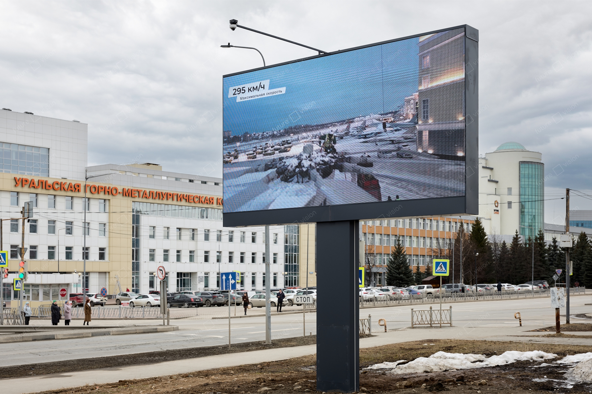 Компания Future Vision изготовила и установила уличный двусторонний LED экран в городе Верхняя Пышма. Светодиодный билборд размером 5,7 х 2,8 м работает бесперебойно 24/7 и воспроизводит рекламный и социальный контент.