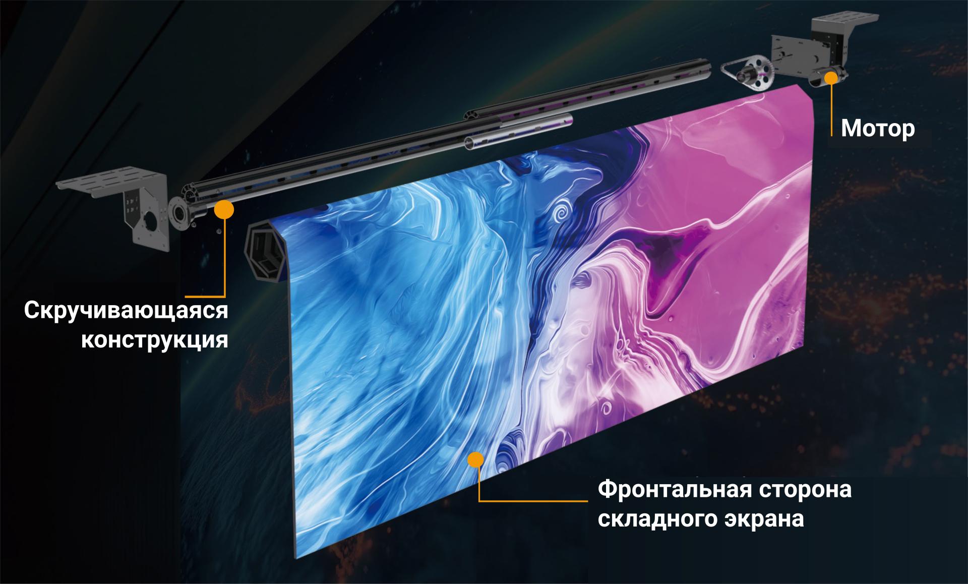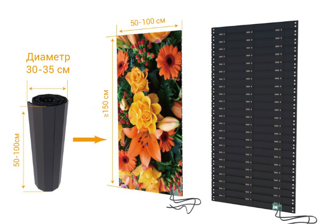 Светодиодные складывающиеся экраны представляют собой конструкцию, которую можно сворачивать в рулон. Основная отличительная особенность заключается в том, что вы в любой момент при необходимости можете развернуть экран, а потом свернуть его обратно. Рулонные светодиодные экраны мобильны – легко транспортируются благодаря своим компактным размерам в собранном виде, помимо этого они очень просты в установке – складные конструкции быстро монтируются, сокращая время на подготовку к мероприятию. В сравнении с традиционными светодиодными экранами, конструкция рулонных более тонкая и легкая.