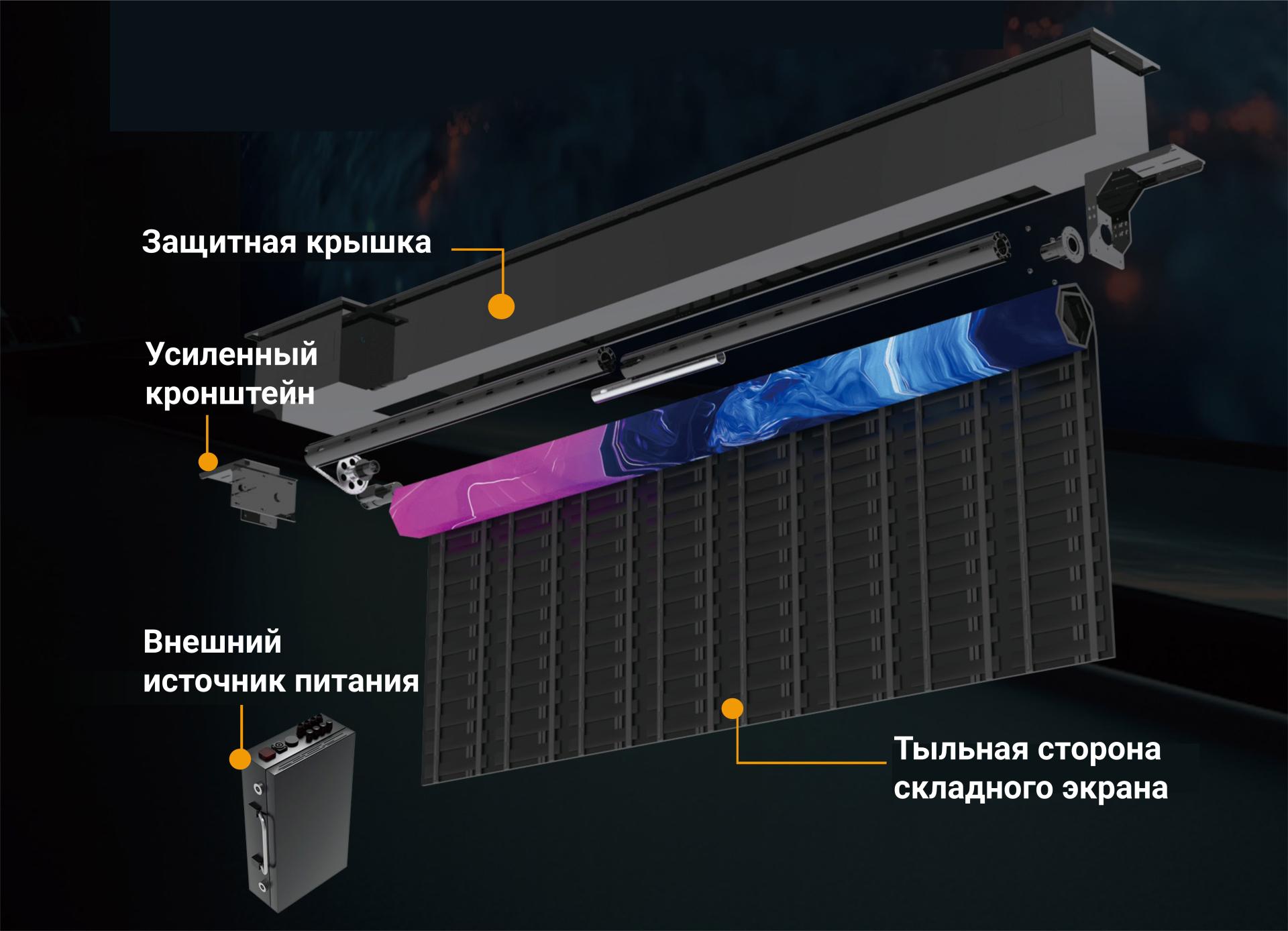 Возможность исполнения в разных размерах. Используется принцип раздвижных штор: автоматически опускаются и поднимаются одним нажатием кнопки. Скрытая установки движка делает всю систему незаметной. Возможно дистанционное управление. По желанию клиента устанавливаются дополнительные боковые стойки. Складные led экраны для конференц-залов отличаются отличной цветопередачей, высоким уровнем детализации и насыщенностью цветов.