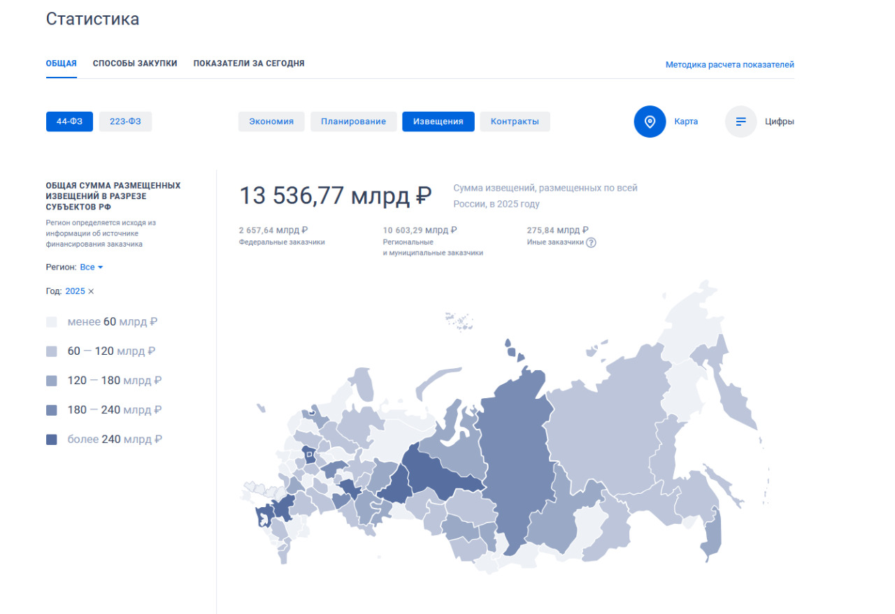 Статистика опубликованных закупок по 44-ФЗ в 2025 году на сумму 13 536,77 млрд. рублей говорит о том, что госзакупки по‑прежнему остаются рабочим инструментом для тех, кто подготавливает необходимую документацию и участвует в тендерах системно.